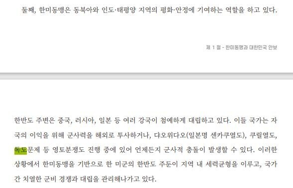 한편, 신원식 국방부 장관은 같은 날 열린 기자간담회에서 “오늘 대통령을 수행하러 갔다가 질책을 받았다. 일반 국민은 깊이 모를 수 있어도 적어도 책임있는 공직자라면 독도를 국제분쟁화하려는 일본에 말려들어선 안된다는 게 공식 입장”이라며 “그렇게 기술한 것에 대해 (대통령이) 좀 어이없어 하셨고 저도 할 말이 별로 없었다”고 말했다.