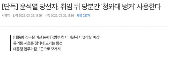 윤석열 대통령 당선자가 5월10일 취임 이후에도, 현재 머물고 있는 "통의동 금융감독원 연수원을 집무실" 로 사용하면서 "국가위기관리센터인 청와대 지하벙커" 를 오가며 위기 상황에 대응하기로 했다는 보도가 나왔다.