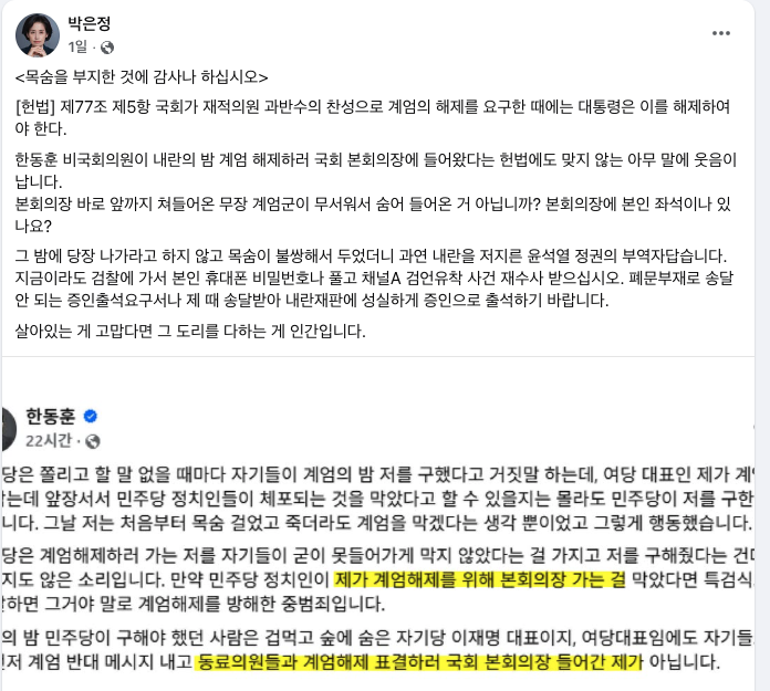 박 의원은 “그날 목숨을 부지한 것만으로도 감사해야 한다”며, “계엄 해제 표결에 참여한 국회의원도 아닌 한 전 대표가 헌법까지 왜곡하며 ‘계엄 저지 영웅’ 행세를 하고 있다”고 일침을 날렸다.