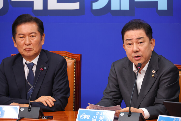 | ▲ 더불어민주당 김병기 원내대표가 6일 서울 여의도 국회에서 열린 최고위원회의에서 발언하고 있다. 왼쪽은 정청래 대표. 2025.8.6 (사진=연합뉴스) |