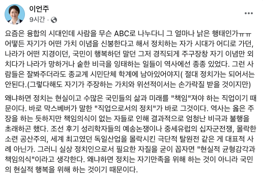 이번 ‘ABC론’ 논쟁 역시 같은 맥락으로 해석된다. 유 작가는 대통령 지지층과 정치권을 유형화하며 일부를 ‘기회주의적 정치세력’으로 규정했는데, 이에 대해 이 의원은 “정치는 이념이 아니라 현실적 균형감각과 책임의식이 중요하다”며 정치관 자체를 비판했다.