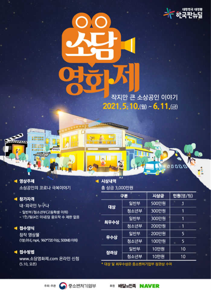 중소벤처기업부(장관 권칠승, 이하 중기부)는 전 국민을 대상으로 5월 10일(월)부터 6월 11일(금)까지 ‘제1회 소담 영화제’ 영상을 접수 받는다고 밝혔다. ‘소담 영화제’란 중기부가 배달의 민족과 네이버 후원으로 올해 처음 개최하는 ‘소상공인 디지털 영화제’(영상 공모전)로 제1회 소담 영화제의 주제는 ‘소상공인의 코로나 극복기’이다.