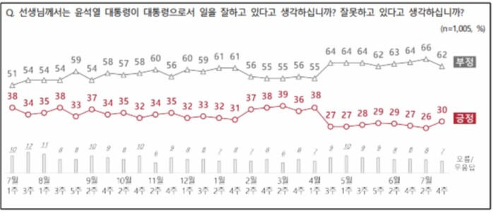 엠브레인퍼블릭·케이스탯리서치·코리아리서치·한국리서치가 지난 22∼24일 전국 만 18세 이상 남녀 1천5명을 대상으로 진행한 전국지표조사(NBS)에 따르면 윤 대통령이 국정 운영을 잘하고 있다고 답한 응답자는 30%였다.