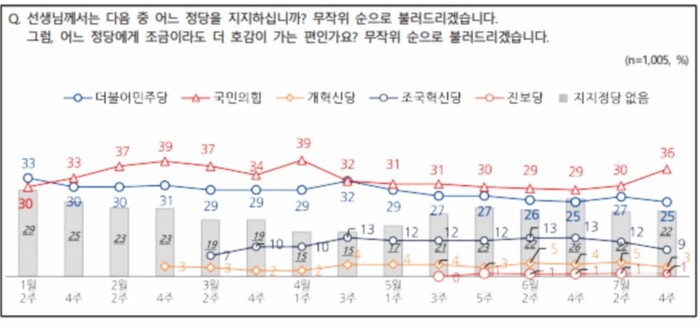 정당 지지도는 국민의힘 36%, 더불어민주당 25%, 조국혁신당 9%, 개혁신당 3%, 진보당 1%, '지지 정당 없음·모름·무응답' 22%였다.