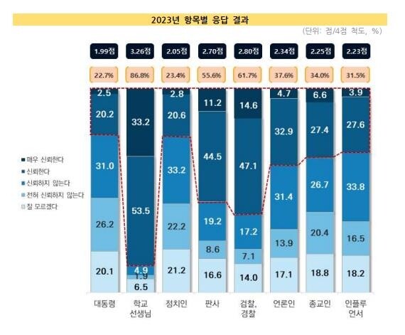 21일 한국교육개발원과 교육정책 네트워크가 공개한 '2023 교육정책 인식조사'에 의하면 우리나라 중·고등학생 사이에서 정치인에 대한 신뢰도가 최하위권을 기록 중인 것으로 드러났다.
