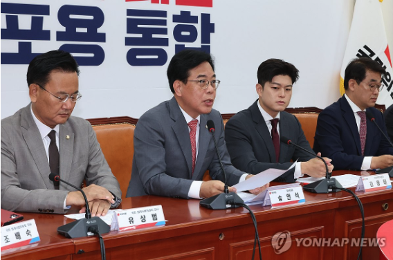 ▲ 이재명 정부 인사청문회 대책회의에서 발언하는 송언석 국민의힘 원내대표. 왼쪽 유상범 의원, 오른쪽 김용태, 배준영 의원 2025.6.19 (사진=연합뉴스)