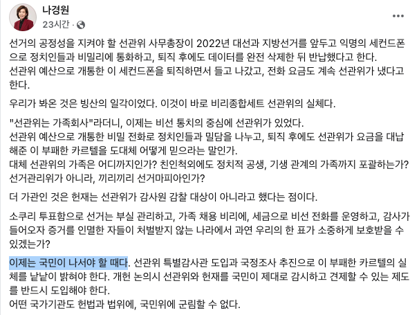나 의원은 “선관위는 가족회사라더니, 이제는 비선 통치의 중심에 선관위가 있었다”며 “선관위 예산으로 개통한 비밀 전화로 정치인들과 밀담을 나누고, 퇴직 후에도 선관위가 요금을 대납해준 이 부패한 카르텔을 도대체 어떻게 믿으라는 말이냐”고 꼬집었다.