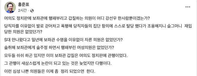 홍 전 시장의 폭로는 여기서 그치지 않았다. 그는 “S대 안 나왔다고 1년에 보좌관 수명을 이유 없이 자른 의원은 없었던가? 술 취해 보좌관에게 술주정하면서 행패 부린 여성 의원은 없었던가?”라며 추가적인 갑질 사례들을 열거했다. 그는 “이런 심성 나쁜 사람들은 이제 좀 정리되었으면 한다”고 덧붙였다.