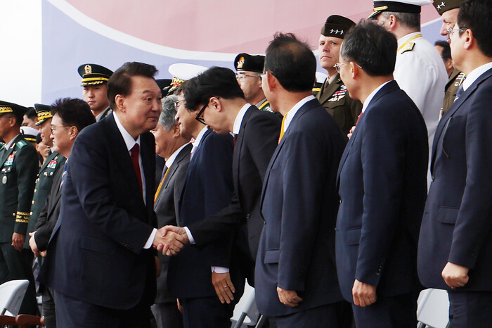 | ▲국군의날 기념식에서 인사 나누는 윤석열 대통령과 한동훈 국민의힘 대표 (사진=연합뉴스) |