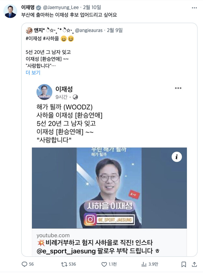 이 대표의 X 계정에는 지난 9일밤 11시 57분부터 자정을 넘겨 설이 된 10일 0시 6분에도 여러 글을 올리며 더불어민주당에 대한 지지를 호소했다.