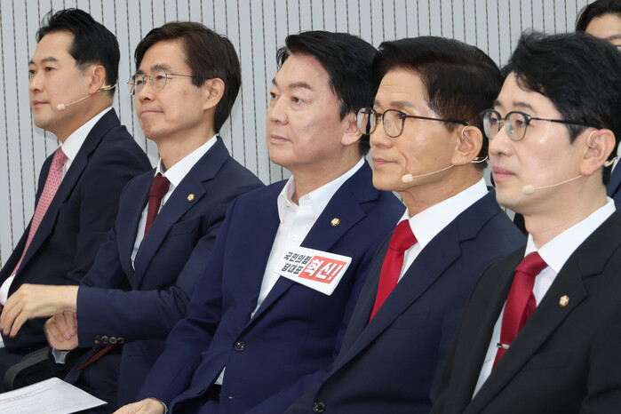 | ▲ 국민의힘 주진우(오른쪽부터)·김문수·안철수·조경태·장동혁 당 대표 후보가 3일 서울 여의도 국민의힘 당사에서 열린 제6차 전당대회 후보자 비전대회에서 송언석 비상대책위원장 겸 원내대표의 발언을 듣고 있다. 2025.8.3 (사진=연합뉴스) |