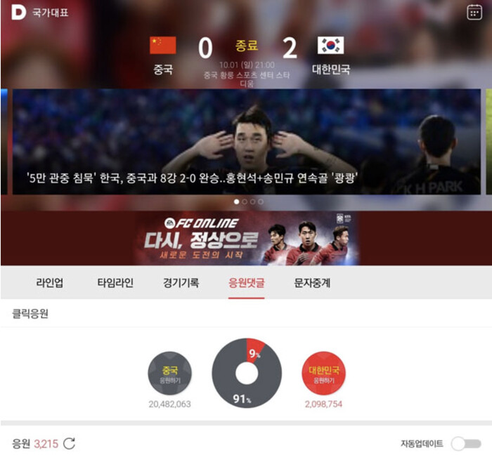 지난 1일 열린 항저우 아시안게임 축구 한국과 중국의 8강전 당시 다음 응원 페이지에서는 중국팀을 클릭해 응원한 비율이 한때 전체의 91%에 달해 논란이 일었다.