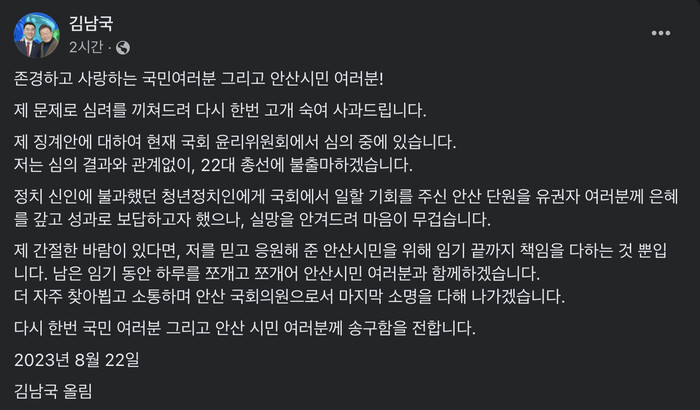 그는 "정치 신인에 불과했던 청년 정치인에게 국회에서 일할 기회를 주신 안산 단원을 유권자 여러분께 은혜를 갚고 성과로 보답하고자 했으나 실망을 안겨드려 마음이 무겁다"고 적었다.