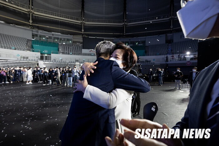 | ▲ 이재명 제20대 대선 대통령후보 선출에게 축하하는 추미애 후보, |