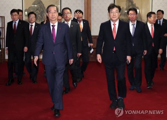 | ▲ 한덕수 대통령 권한대행 국무총리와 권성동 국민의힘 대표 권한대행 겸 원내대표 (사진=연합뉴스) |