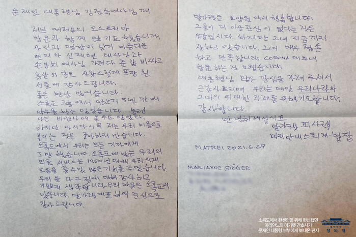 편지에서 마리안느 간호사는 “문재인 대통령님, 김정숙 여사님 저는 여러분의 오스트리아 방문과 함께 많이 기도했다”며 “사진과 명함이 담긴 아름다운 편지와, 홍삼과 담요, 사랑스럽게 포장된 선물에 감사드린다"고 말했다.