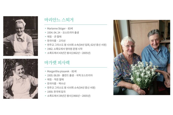 마리안느와 마가렛 간호사는 20대인 1962년과 59년에 각각 한국으로 넘어와, 약 40년간 소록도에서 한센인을 위해 자원봉사를 했습니다. 그러다 2005년 건강이 악화되자, "부담이 되고 싶지 않다"는 편지 한 통을 남겨두고 조용히 출국했습니다. 두 간호사는 2016년 6월 "대한민국 명예국민"이 되었고, 2017년에는 "두 분의 삶을 재조명한 다큐멘터리 영화가 제작"되어 한국과 오스트리아에서 상영되기도 했습니다.