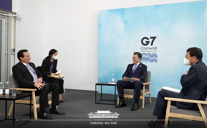 문재인 대통령은 12일 오전(현지시각) G7 정상회의가 열리는 영국 현지에서 아스트라제네카사의 파스칼 소리오(Parscal Soriot) 글로벌 CEO를 면담했다.