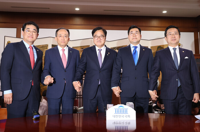 | ▲원내대표단과 함께 한 우원식 국회의장 (사진=연합뉴스) |