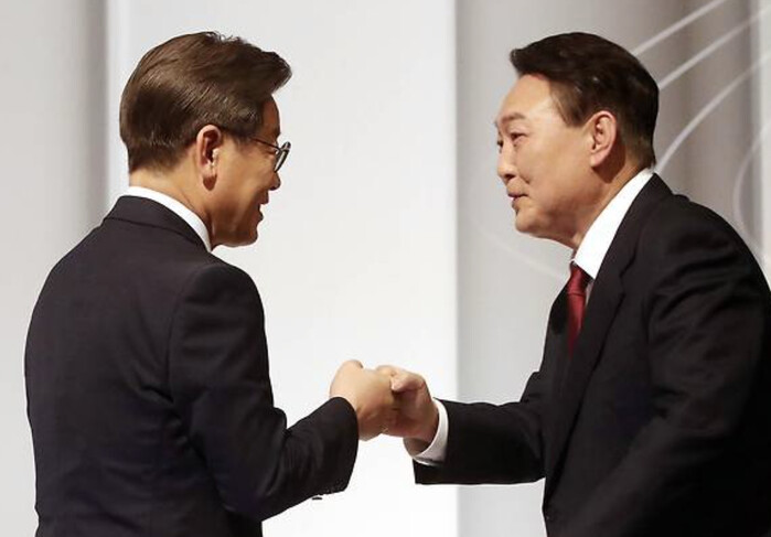 | ▲대선 토론당시 만난 이재명 대표와 윤석열 대통령 (사진=연합뉴스) |