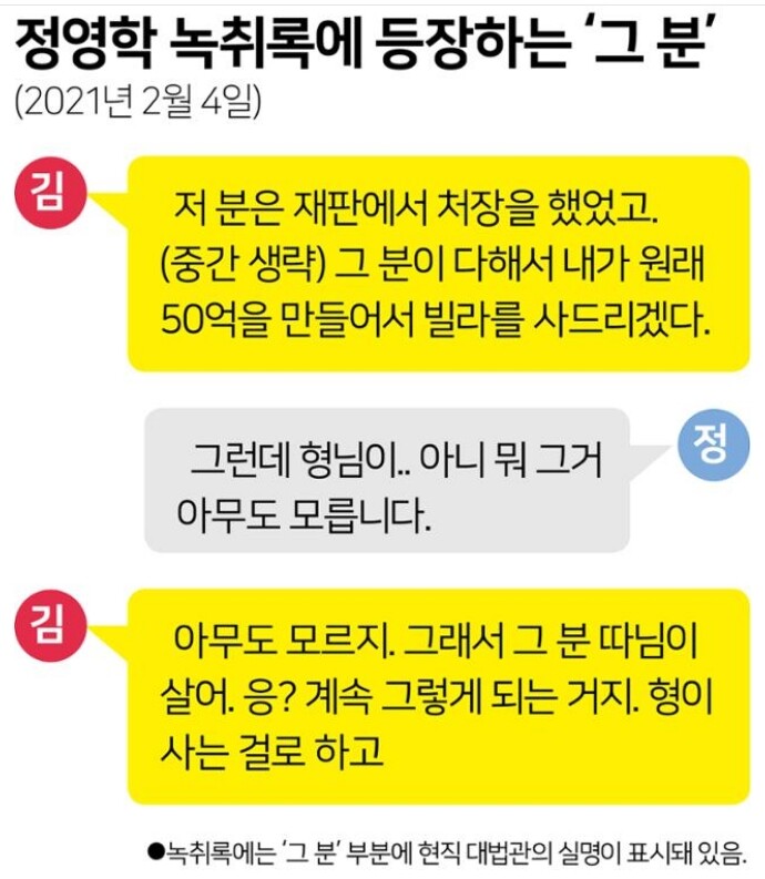한국일보 보도에 의하면 2021년 2월 4일 "김만배·정영학 녹취록을 입수하였고 분석" 한 결과, 두 사람이 '그분'을 언급하며 주고받는 부분이 나온다고 한다. 그 부분은 경기 성남시에서 정영학(54)회계사를 만난 화천대유 대주주 김만배(56)씨가 A대법관을 입에 올리며 한 말이며, 김씨는 A대법관 자녀가 김씨의 도움으로 "특정 주거지에 거주하는 듯한 발언" 을 이어갔다.
