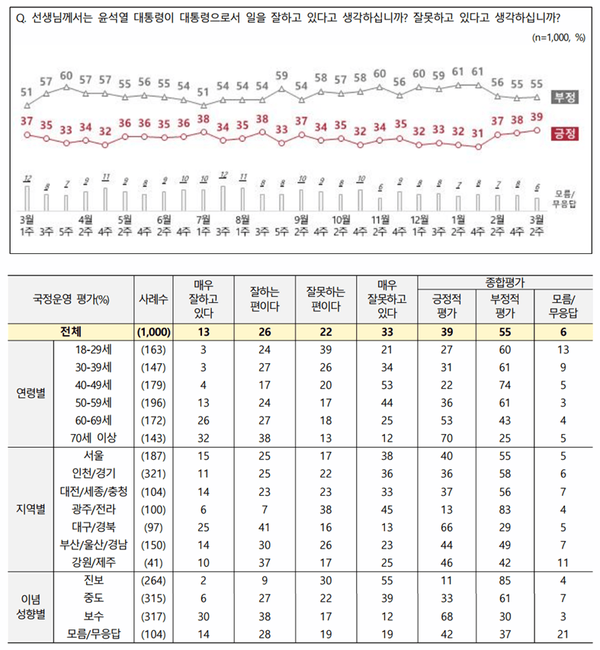 윤석열 대통령의 국정 지지율이 2주 사이 소폭 올랐다. 윤 대통령의 국정 운영에 대해 '잘하고 있다'는 평가는 39%, '잘못하고 있다'는 55%였다.