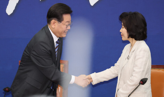 | ▲민주당 이재명 당대표와 인사를 나누는 김은경 혁신위원장 (사진=연합뉴스) |