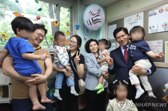 | ▲ 국민의힘 김문수 대선 후보와 배우자 설난영 여사, 딸 김동주 씨 부부가 22일 경기도 광명시의 한 어린이집을 방문해 어린이들과 기념 촬영하고 있다. 2025.5.22 (사진=연합뉴스) |