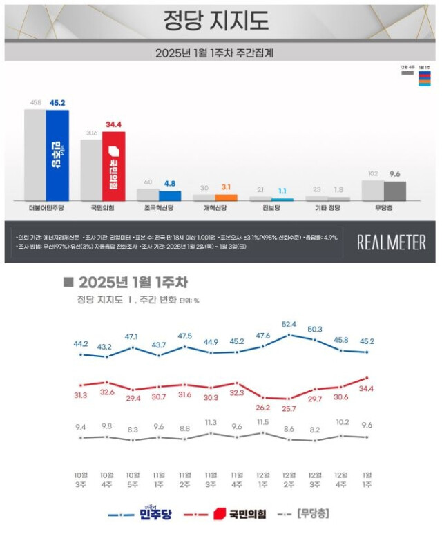 리얼미터가 에너지경제신문 의뢰로 지난 2∼3일 전국 성인 1001명을 대상으로 조사(95% 신뢰수준에 표본오차 ±3.1%포인트)한 결과, 1월 1주차 국민의힘 지지도는 전주보다 3.8%포인트 상승했고, 더불어민주당은 전주보다 0.6%포인트 하락했다. 리얼미터는 “민주당이 3주 연속 하락한 반면 국민의힘은 3주 연속 상승했다”며 “양당 간 차이는 10.8%포인트로 좁혀지며 15주째 오차범위 밖(±3.1%포인트)을 이어갔다”고 말했다.