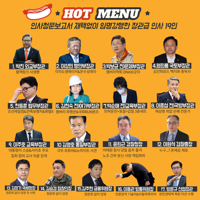 관련하여 클리앙 등의 대형 커뮤니티에는 윤석열 정부 들어 인사 청문보고서 채택없이 임명된 장관급 인사 19명에 대한 포스터가 등장해 화제를 일으켰다.