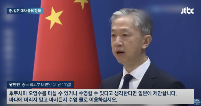 한편, 중국은 이번 오염수 방류에 관해 처음부터 반대 입장이었으며 이와 관련 왕원빈 중국 외교부 대변인은 "후쿠시마 오염수를 마실 수 있거나 수영할 수 있다고 생각한다면 바다에 버리지 말고 마시든 수영 물로 이용하라"며 강하게 비판했다.