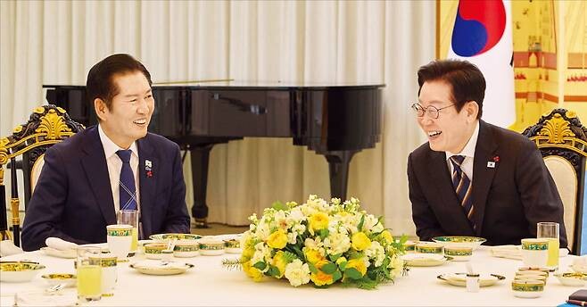 | ▲ 이재명 대통령과 쩡청래 민주당 대표가 19일 만찬에서 파안대소하고 있다. (제공=청와대) |