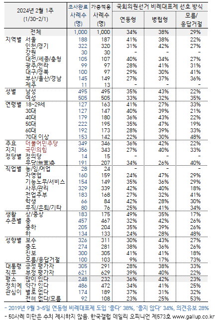 한국갤럽은 "2018년 11월, 2019년 5월·9월 실시한 조사에서는 당시 여당이던 더불어민주당 지지자 과반이 연동형 비례대표제 도입에 긍정적이었다"면서 "2024년 현 시점 민주당 지지자 일부가 병립형으로 선회했다"고 설명했다.