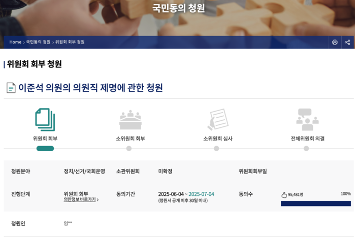 국회전자청원에 제기된 '이준석 의원의 의원직 제명에 관한 청원'은 국민 8만6429인의 동의로 위원회에 회부됐다. 현재는 동의자 수가 9만5000명을 넘어선 상태다.