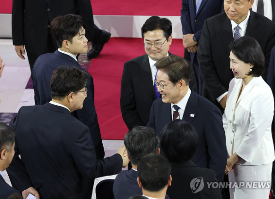 | ▲ 서울 여의도 국회에서 열린 제21대 대통령 취임선서식, 이재명 대통령 부부와 권성동 국민의힘 원내대표 (사진=연합뉴스) |