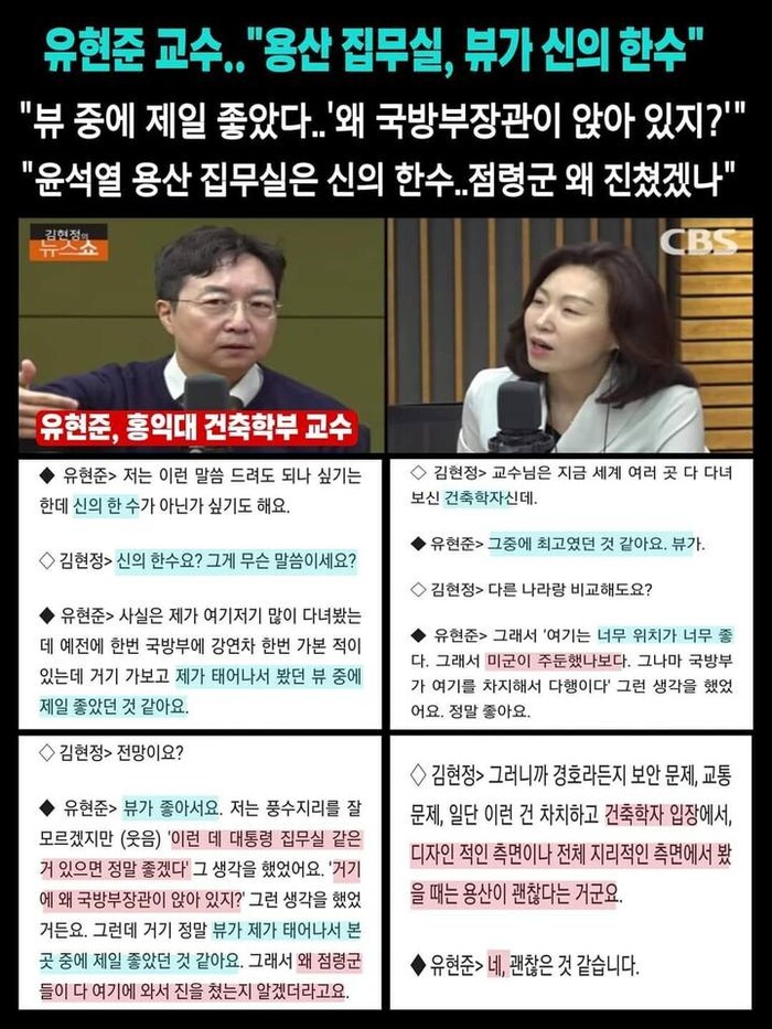 김진애 전 의원이 언급한 용산 '뷰'가 좋다고 청사 이전에 호의적이었던 건축가는 유현준 홍익대 교수다. 유 교수의 형 유현석씨는 김건희씨와 함꼐 윤 당선인 인스타를 총괄하는 홍보 담당자다.