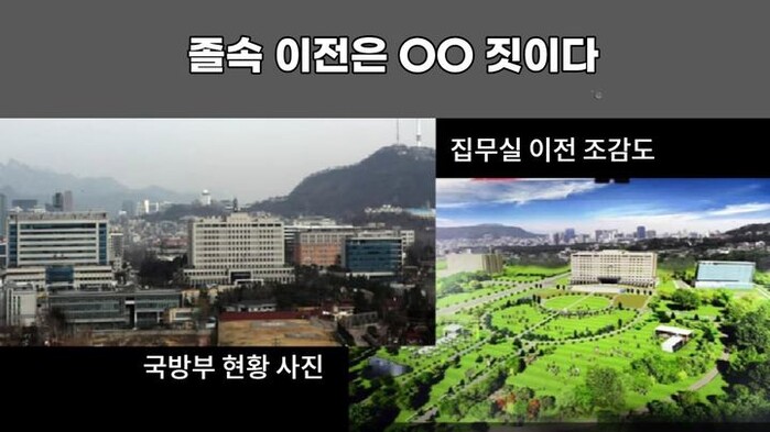 그러면서 "누가 날밤 새고 그렸는지 모르겠지만 어제 조감도는 다분히 눈속임 가짜였다"라며 "기존에 있는 국방부 건물들 다 지워버리고, 건물들 사이도 멀게 그려놓고, 삼각지 용산 재개발의 초고층 건물들 싹 빼고 온통 푸른 공원으로 도배했으니, 눈속임이다"라고 실제 사진과 조감도를 게시했다.