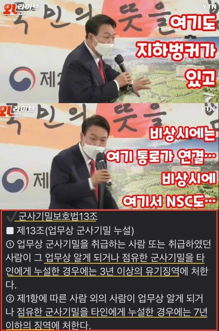 그는 "그런 것도 사실 보안이다. 지하 통로가 있다 등등 그런 것을, 공공연히 보안 사항이 노출되는 것 같다" 라며 "언론에 청와대 경호 방호나 국방부와 합참 이런 것들이 노출될 수밖에 없지 않나. 안타깝고 우려하는 사항" 이라고 비판했다.