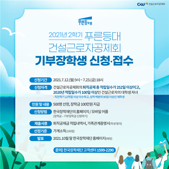건설근로자공제회(이사장 송인회, 이하 공제회)는 건설근로자의 자녀 교육비 부담을 경감하고, 대학생 자녀들이 생활비 걱정 없이 학업에 열중할 수 있도록 지원하기 위해 2021년 2학기 「푸른등대 건설근로자공제회 기부장학생」을 선정하여 장학금을 지급한다.