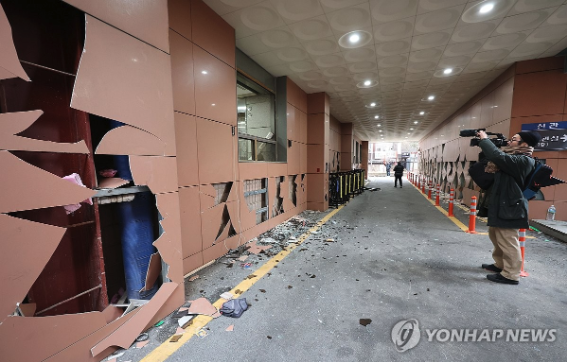 | ▲ 2025.1.19 내란수괴 윤석열이 구속되자 반인권 세력들이 서울서부지법을 습격해 창과 외벽 등을 훼손했다 (사진=연합뉴스) |