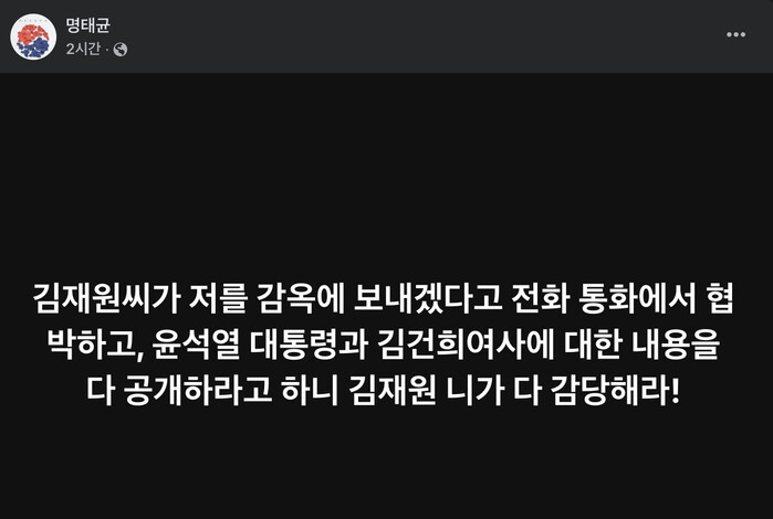 이에 명 씨는 15일 자신의 SNS에 "김재원 씨가 저를 감옥에 보내겠다고 전화 통화에서 협박하고, 윤 대통령과 김 여사에 대한 내용을 공개하라고 한다, 너의 세치 혀 때문에 보수가 또 망하는구나"라는 글과 함께 캡처 이미지를 공개했다.