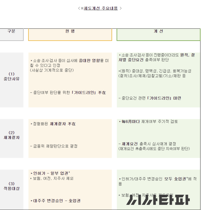 금융위원회와 금융감독원은 금융권 신규 인허가 및 대주주 변경승인 시 현행 심사중단제도의 문제점을 해소하기 위해 「금융권 인허가 심사중단제도 개선방안」을 마련하였습니다.