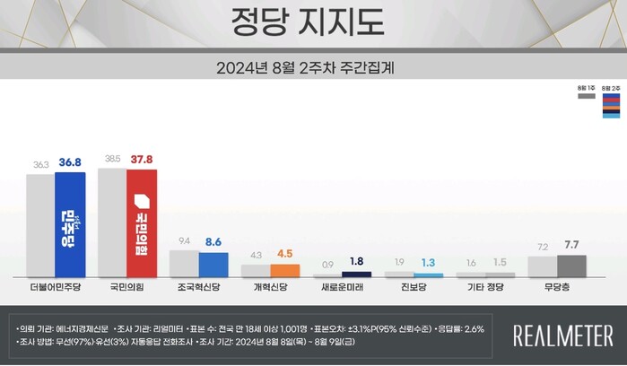 지난 8∼9일 전국 18세 이상 유권자 1천1명을 대상으로 이뤄진 정당 지지도 조사(95% 신뢰수준에 표본오차±3.1%p)에서는 국민의힘이 37.8%, 더불어민주당이 36.8%를 기록했다.