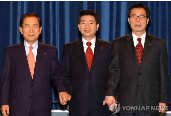 | ▲ 2002.12.10 16대 대선 후보 합동토론회, 왼쪽부터 이회창 한나라당 후보, 노무현 새천년민주당 후보, 권영길 민주노동당 후보 (사진=연합뉴스) |