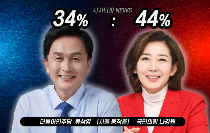 서울 동작을에서는 국민의힘 나경원 후보가 44%를 얻어 민주당 류삼영 후보(34%)를 앞섰다.