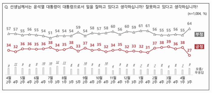 엠브레인퍼블릭·케이스탯리서치·코리아리서치·한국리서치가 지난 15∼17일 전국 만 18세 이상 남녀 1천4명을 대상으로 진행한 전국지표조사(NBS)에 따르면, 윤 대통령의 국정 운영에 대해 '잘하고 있다'는 27%, '잘못하고 있다'는 64%였다.