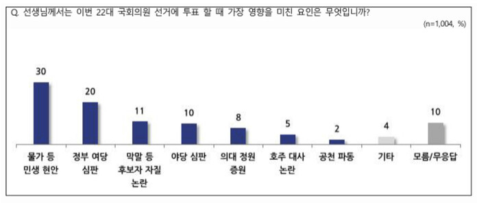 총선과 관련한 투표요인 분석에서는 물가 등 민생 현안이 가장 높게 나타났고 정부여당 심판이 그 다음으로 이어졌다.