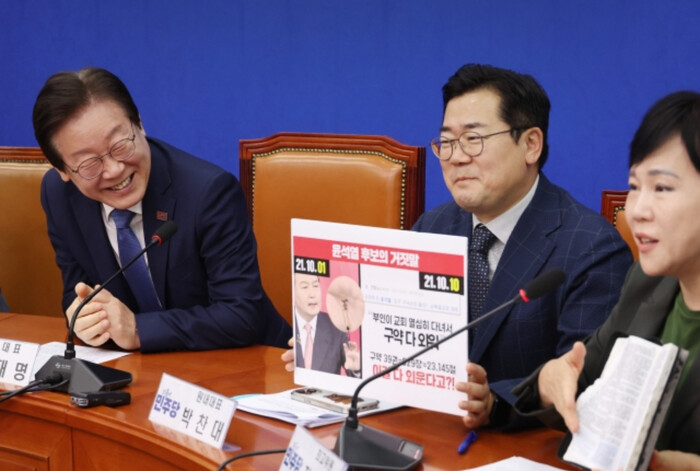 이 대표는 27일 국회 최고위에서 ‘김건희 여사가 구약성경을 다 외운다’는 취지로 말한 윤석열 대통령을 언급하며 “제가 이렇게 했으면 아마 ‘외우냐, 못 외우냐’고 해서 한 징역 5년쯤을 받지 않았을까 싶다”고 말했다.