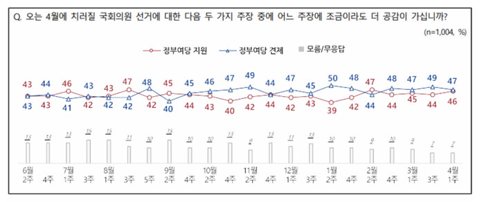 총선의 성격에 대해선 ‘국정운영을 더 잘하도록 정부와 여당에 힘을 실어줘야 한다’는 응답이 46%, ‘정부와 여당을 견제할 수 있도록 야당에 힘을 실어줘야 한다’는 응답이 47%로 팽팽했다.