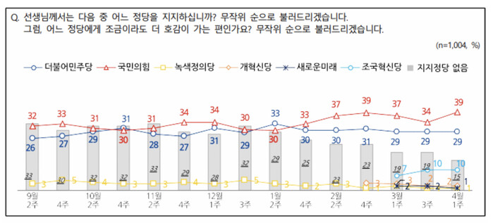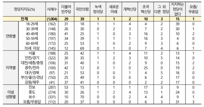 정당 지지도는 국민의힘 39%, 더불어민주당 29%, 조국혁신당 10%로 나왔다.